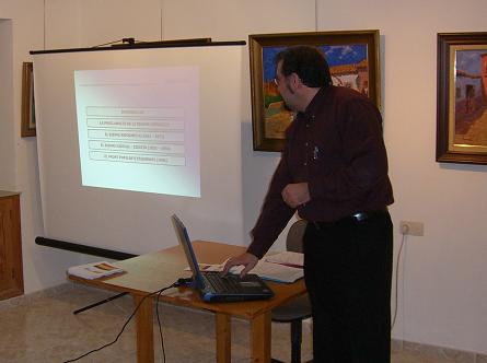 En presència de la gent que omple el recinte, el conferenciant Arnau Company fa una repassada històrica sobre allò que fou la vida democràtica espanyola entre els anys 1931 i 1939, a Mallorca.